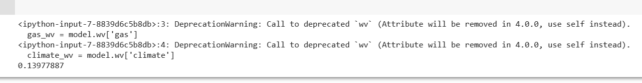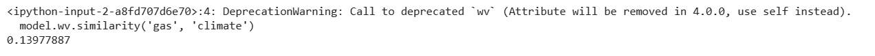 The above code computes the similarity between words ‘gas’ and ‘climate’