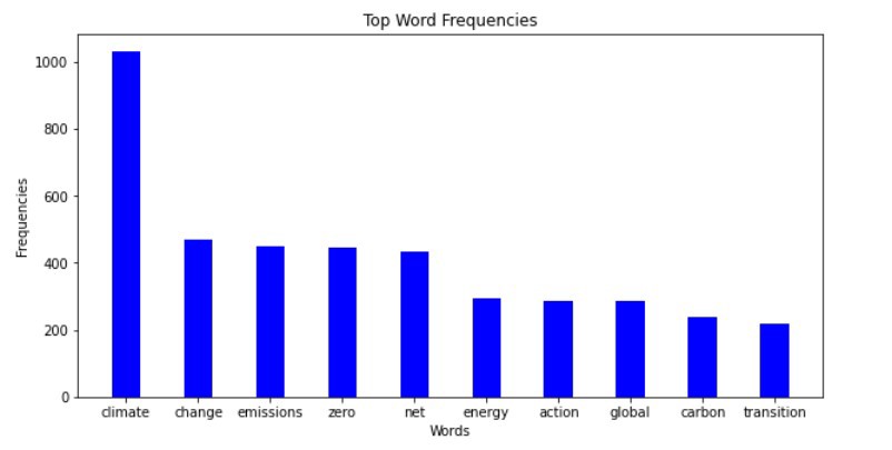 {‘climate’: 1032, ‘change’: 471, ‘emissions’: 450, ‘zero’: 446, ‘net’: 434, ‘energy’: 295, ‘action’: 288, ‘global’: 287, ‘carbon’: 237, ‘transition’: 217}