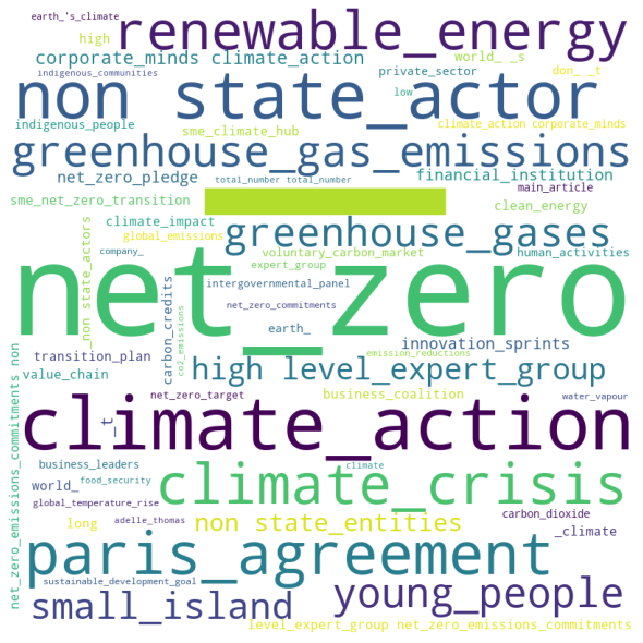 {‘net_zero’: 123, ‘climate_action’: 103, , ‘climate_crisis’: 47, ‘paris_agreement’: 43, ‘non-state_actors’: 41, ‘renewable_energy’: 41, ‘greenhouse_gas_emissions’: 35, ‘young_people’: 31, ‘greenhouse_gases’: 30, ‘sme_net_zero_transition’: 30, ‘corporate_minds’: 26, ‘non-state_entities’: 25, ‘high-level_expert_group’: 24, ‘financial_institutions’: 24, ‘carbon_credits’: 22, ‘net_zero_emissions_commitments’: 21, ‘voluntary_carbon_market’: 20, ‘innovation_sprints’: 20, ‘clean_energy’: 19, ‘world’_s’: 18, ‘global_emissions’: 18, ‘business_coalition’: 17, ‘small_island’: 17, ‘value_chain’: 16, ‘total_number’: 16}