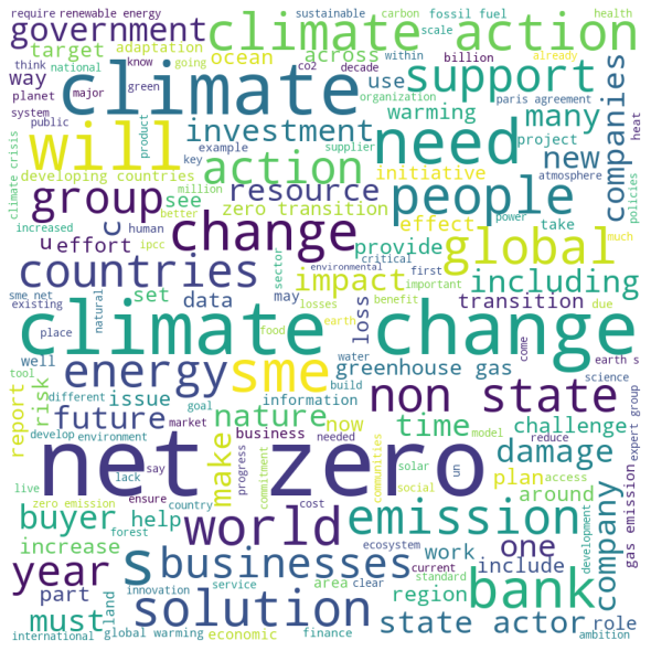 {‘climate’: 1032, ‘change’: 471, ‘emissions’: 450, ‘zero’: 446, ‘net’: 434, ‘energy’: 295, ‘action’: 288, ‘global’: 287, ‘carbon’: 237, ‘transition’: 217, ‘countries’: 215, ‘people’: 213, ‘world’: 206, ‘need’: 202, ‘smes’: 187, ‘also’: 181, ‘banks’: 176, ‘warming’: 166, ‘support’: 153, ‘company’: 149}