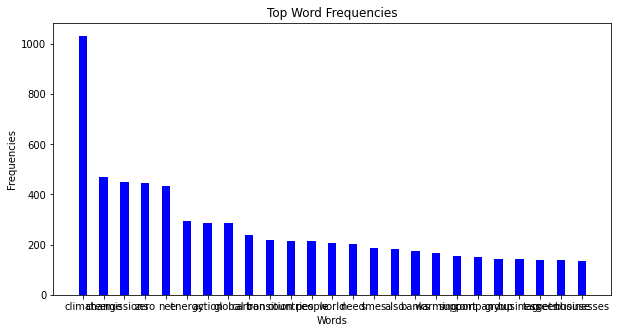 The top 25 value pairs are [‘climate’, ‘change’, ‘emissions’, ‘zero’, ‘net’, ‘energy’, ‘action’, ‘global’, ‘carbon’, ‘transition’, ‘countries’, ‘people’, ‘world’, ‘need’, ‘smes’, ‘also’, ‘banks’, ‘warming’, ‘support’, ‘company’, ‘group’, ‘business’, ‘targets’, ‘greenhouse’, ‘businesses’]