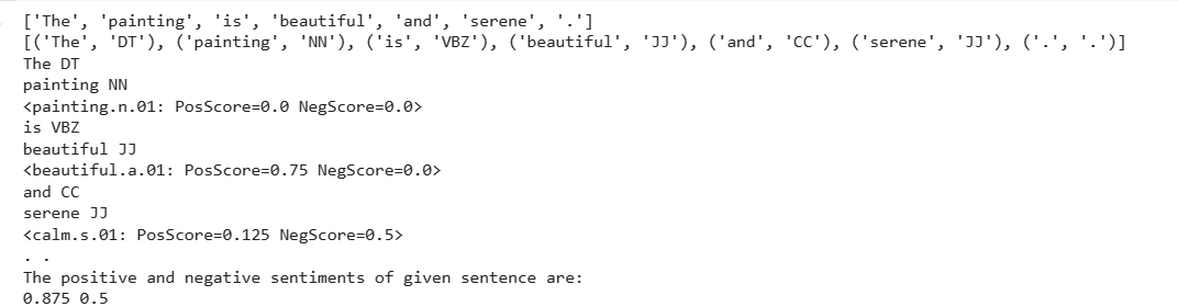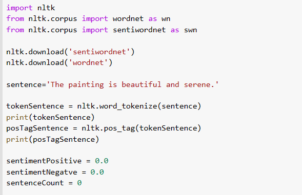 Here is a code for sentiment analysis explained with sentiwordnet. The code is here for determining the sentiment analysis of a sentence.