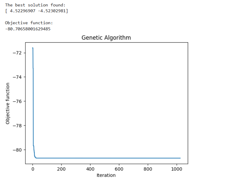 The optimal value is 80 [as -1 was multiplied to solve the problem with GA so now we remove it] and optima occurs at [ 4.52296907 -4.52302981].