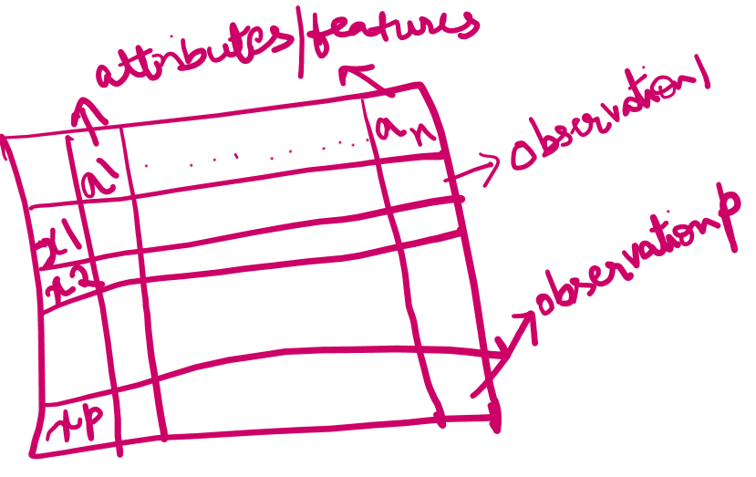 The data for use in Machine Learning is typically in the form of rows and columns. The rows define the values for a particular observation, while the columns define the attributes in which these observations are computed.