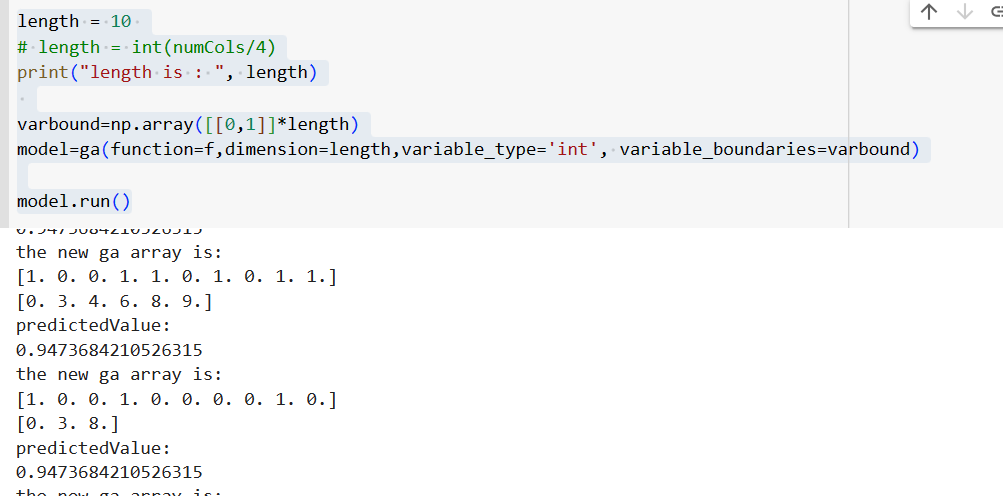 Define parameters and call the Genetic Algorithm to perform feature selection. The dimension of colon cancer data undertaken here is more than 1500, so let’s test on a smaller length of say 10 features. When computing over full data, increase the number of features to one-fourth of the number of columns at least to start with. 10 features are taken just as an example to show how it works.