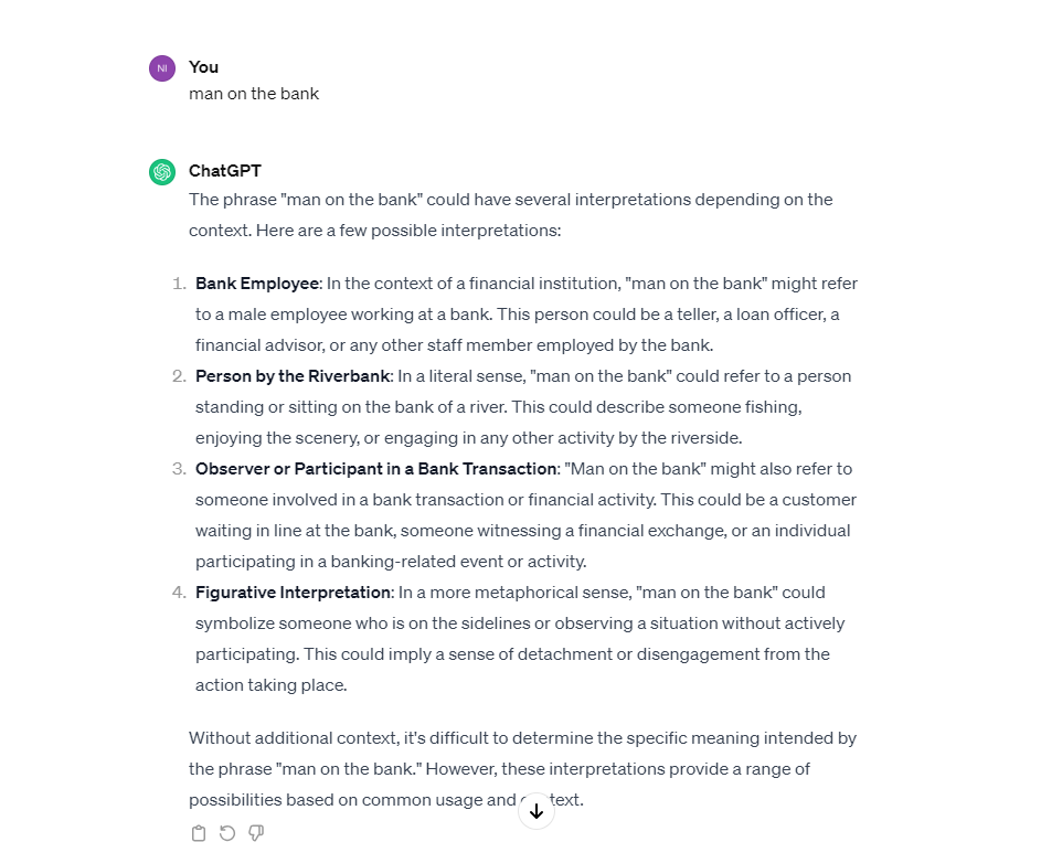 Here the chat engine can disambiguate the sense of the word bank. So, what was different in this, the difference was context. We provided the context more broadly to the chat engine and it responded correctly.