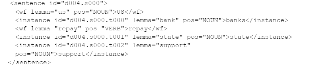 So why we are looking in semeval2013? As it has the word bank, this was the word we were discussing above, for having multiple meanings which need to be disambiguated. You can choose any ambiguous word.