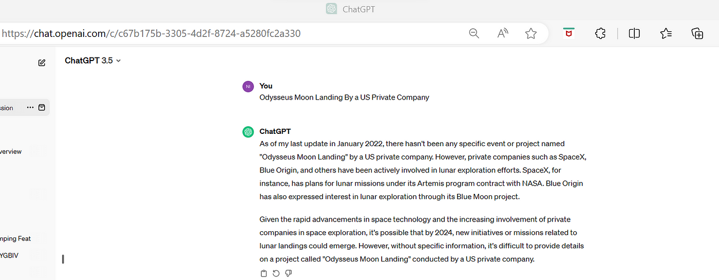 Now, there are cases when the LLM was trained and in this time some new information has been collected. An example of new information since say GPT 3.5, was updated/trained is “Odysseus Moon Landing By a US Private Company”. When searching about it on an LLM it may refer to something else.