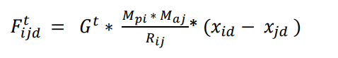 In the gravitational search algorithm, there is law of gravity and law of motion, where in the forces are proportional to masses in the objects and inversely proportional to the distance between the particles. The force of attraction of the i-th particle to the j-th particle [1],