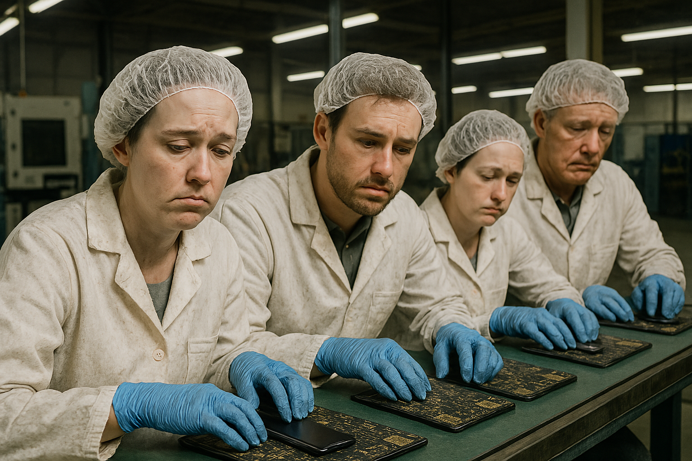 The references below show some videos of sad Americans making phone or hardware work. Firstly, people would have to do some things by hand; other things can be automated. But then, I paused and thought, what? Why are all the Americans shown in the references at the end of the article sad? I tried to generate these pictures on my own. Then, ChatGPT asked me what I wanted. I gave the prompt: “American men and women in a phone chip-making factory.”