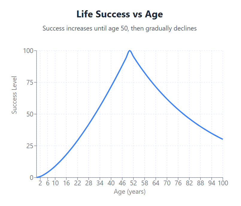 - Early Years (0–50): The derivative is positive, indicating growth. Success accelerates as life progresses through education, career, and personal achievements.