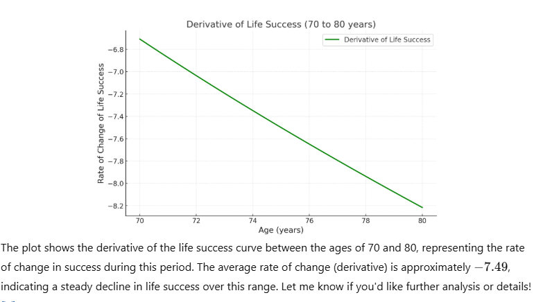 Differentiating the life graph gives insight into the dynamics of life success— highlighting periods of growth, stability, and decline. It provides a mathematical way to analyze life’s trajectory and identify critical moments for reflection, adjustment, or celebration.