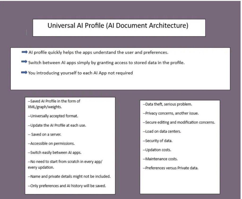 The Universal AI profile is a user-specific profile that helps the AI understand the user and their preferences across devices, apps and browsers. This allows the user to switch between AI apps simply by granting access to stored secure data in the AI Profile. Option to update each access to AI is logged in. As a result, even a new AI app can learn about you without needing to interact with familiar or new topics. The AI Document Architecture enables you to share your AI preferences across various apps, including Gmail, ChatGPT, Docs, Tumblr, and more. Each use brings you closer to sharing with AI, and all the apps you use can access this information if you agree. However, privacy concerns related to this need to be addressed.