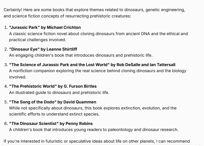 — For example, I asked ChatGPT how to make dinosaurs from eggs found on Mars/Moon? The answer was that it couldn’t be made, as it has books in its mind, and then it asked me if I still wanted to know how to make Dinosaurs. It gave me a list of books.