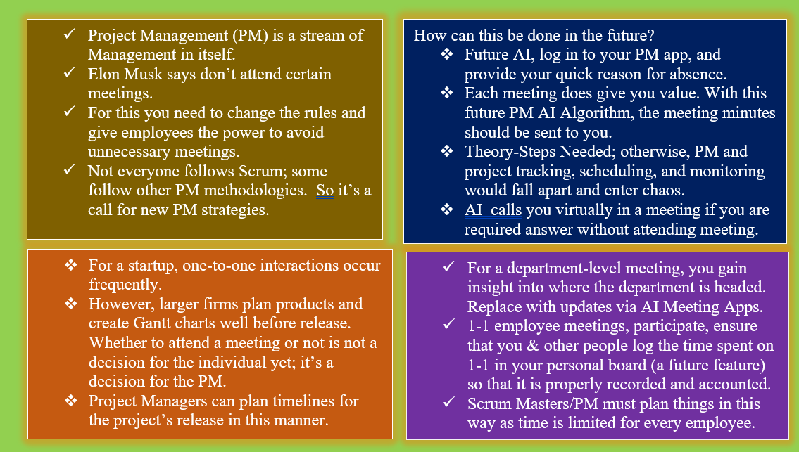 Each meeting does give you value. So, with this future Scrum Master/PM AI Algorithm, Minutes of the Meeting should be sent to you.