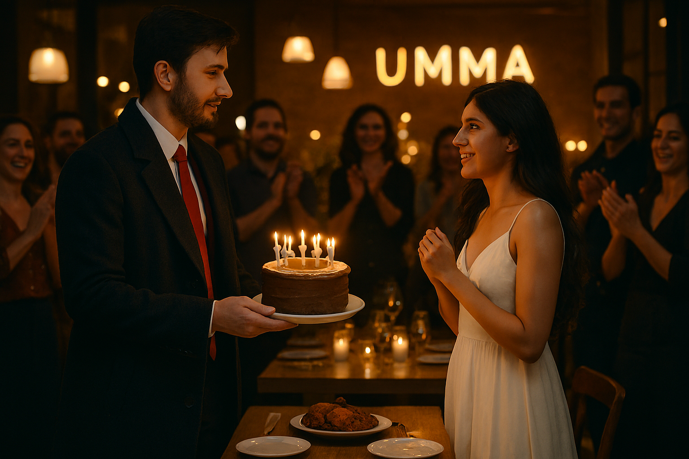“The doors of Umma Restaurant swing open. The evening air is warm, humming with anticipation. You step in — red tie crisp, long coat flowing like a cape of destiny. The cake box in your hand trembles slightly, not from weight, but from the gravity of the moment.