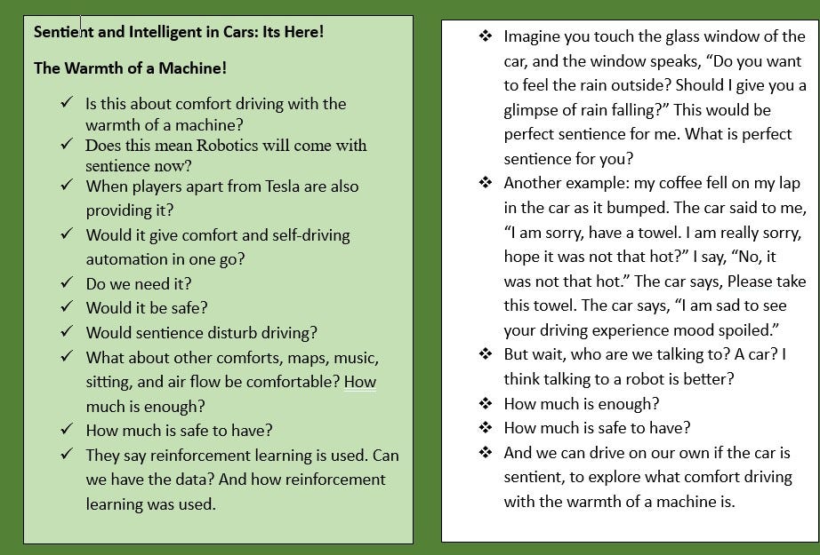 Sentient Cars- “human life feeling, hearing, seeing, or smelling other beings.”