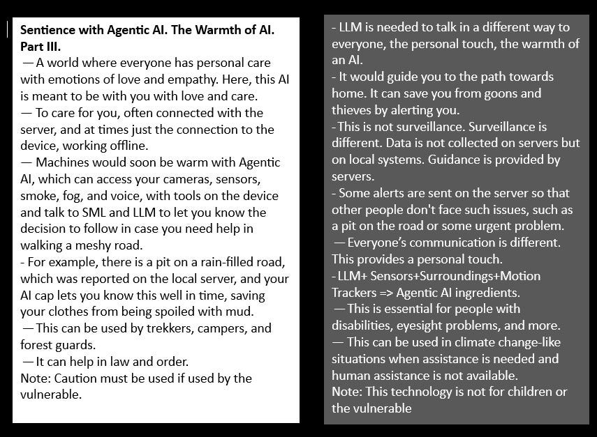 — Sentience can be coded with LLM, and the tools such as vision, sound, and local weather can be extracted with Agentic AI tools to communicate with LLM, which communicates with you.