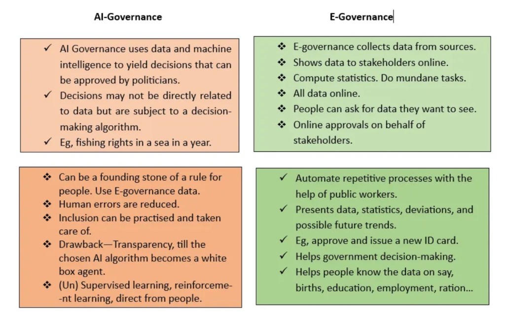 Here are some contrasts between AI governance and E governance where the former uses the later. We are ready with later, so AI governance won’t take much resources.