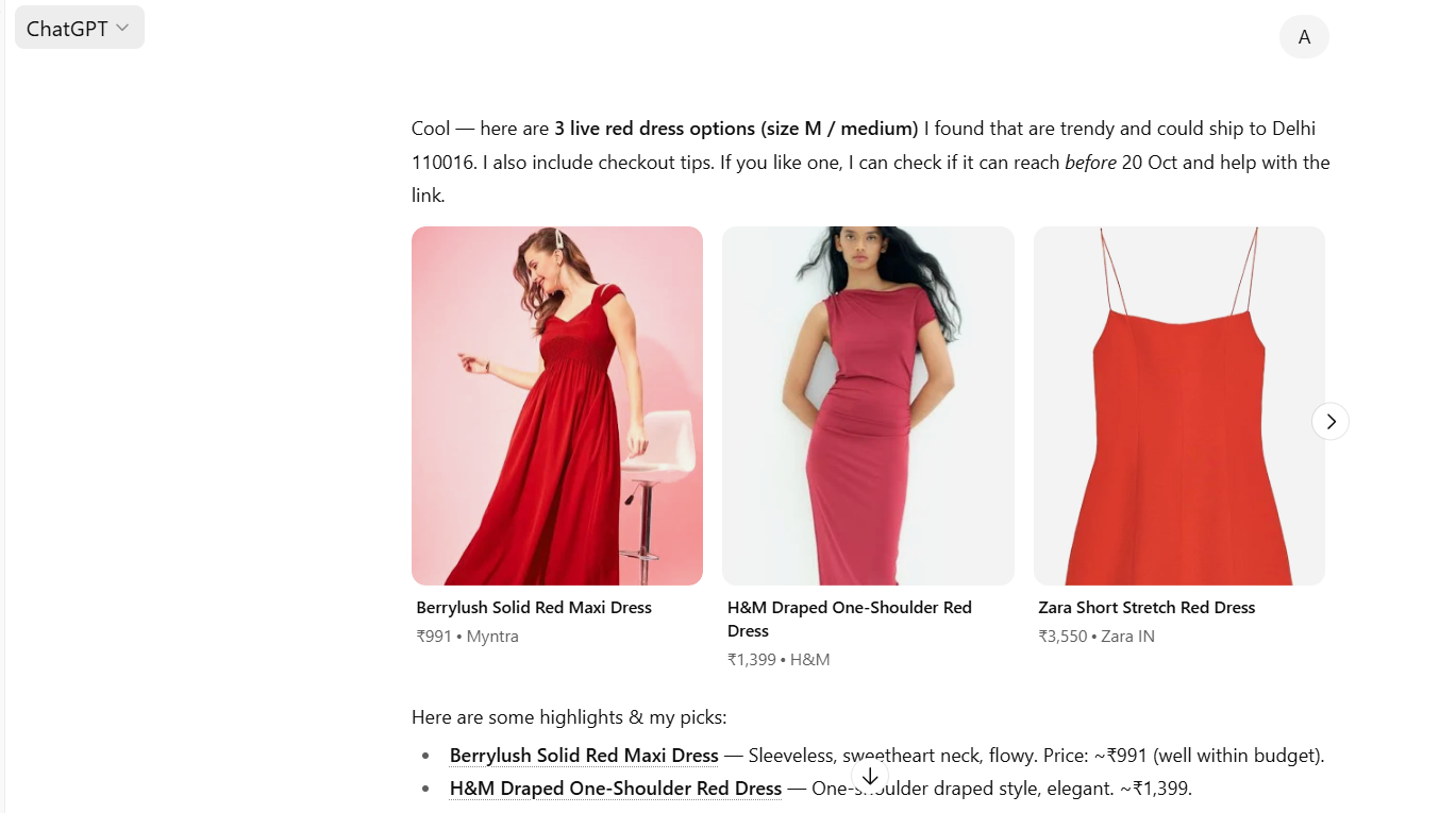 — But if Amazon adds this to its shopping site, will people still use ChatGPT? It depends, as it compares multiple vendors. As below, it compares H&M, Myntra, and Zara — the three vendor sites — for the best answers.