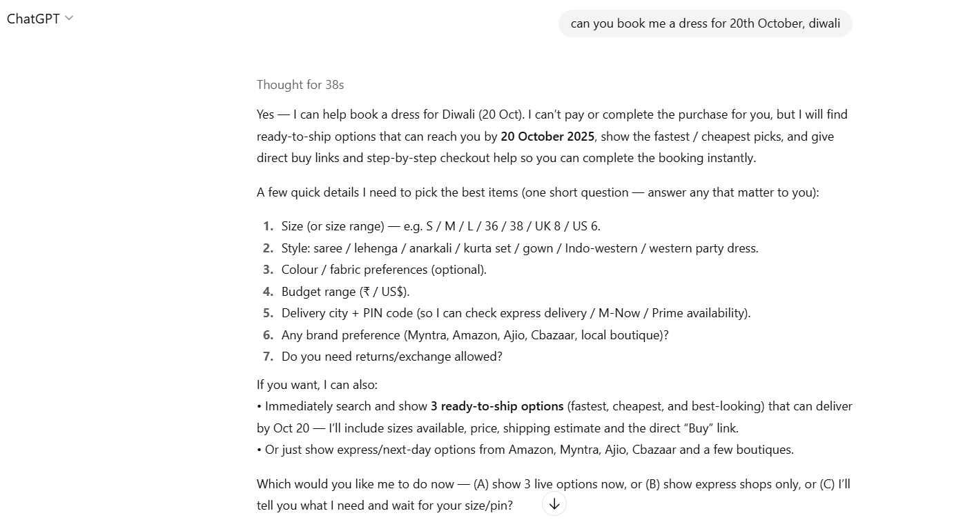 — ChatGPT gives a comprehensive answer to booking an air ticket and shopping for occasions and daily use. See below the ticket booking experience with ChatGPT. It was warm.