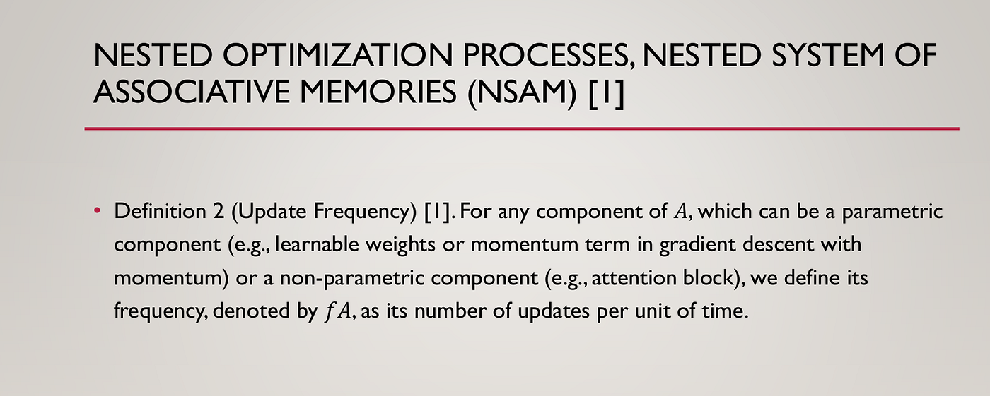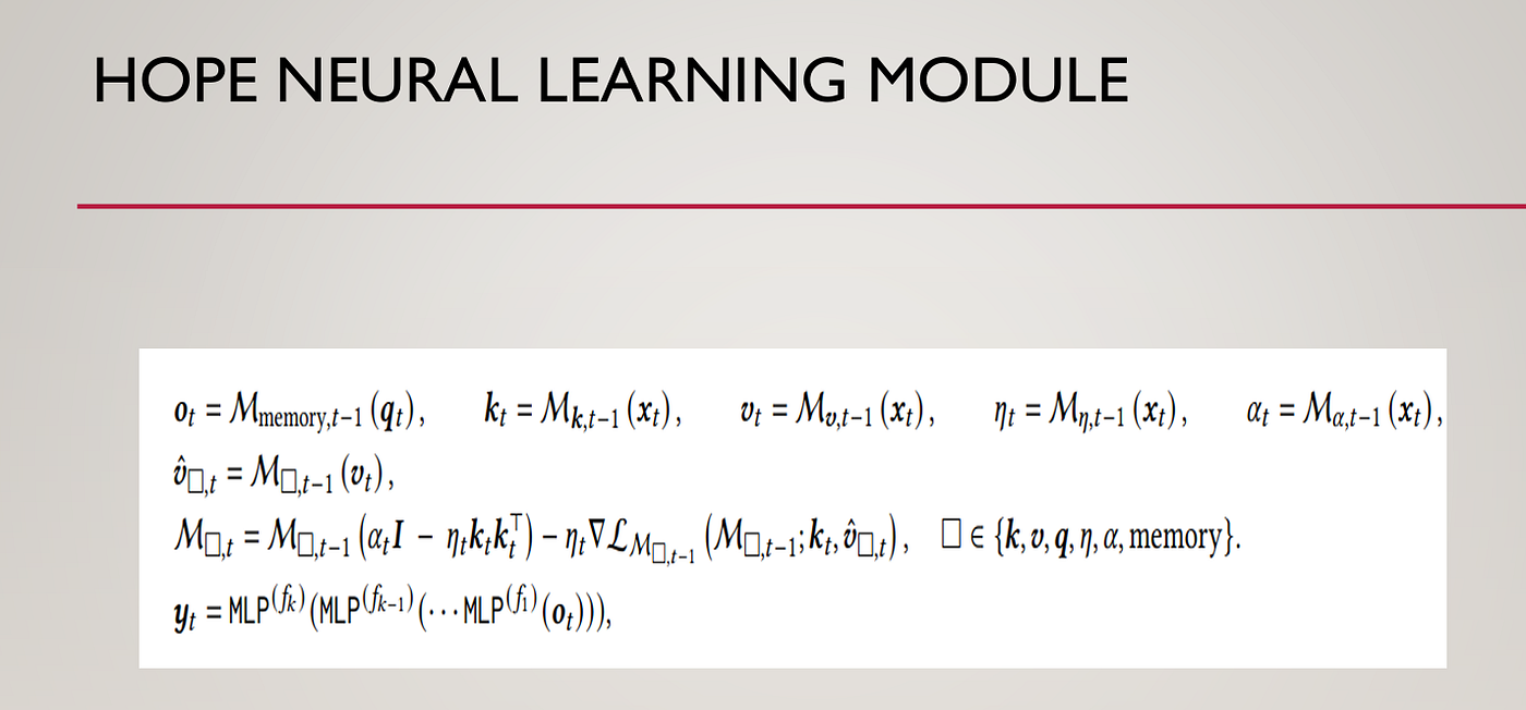 [1] Behrouz, A., Razaviyayn, M., Zhong, P., & Mirrokni, V. (2025). Nested learning: The illusion of deep learning architectures. In The Thirty-ninth Annual Conference on Neural Information Processing Systems.
